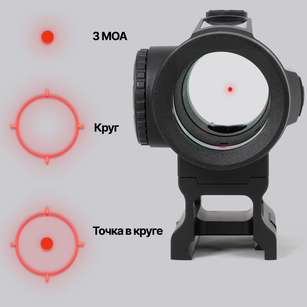 Прицел предлагает три варианта прицельной марки: Классическая точка (3 МОА) - для точной стрельбы на широком диапазоне дистанций от 3 до 300 м; Круговая метка - для стрельбы дробью по движущимся целям, на малых дистанциях; Комбинированная марка "точка 3 МОА в круге" - для динамичной охоты на коротких дистанциях. Подсветка реализована на базе энергосберегательного красного светодиода с 10 уровнями яркости. Примечательно наличие двух приглушенных режимов яркости, оптимизированных эксклюзивно для работы с приборами ночного видения (ПНВ).