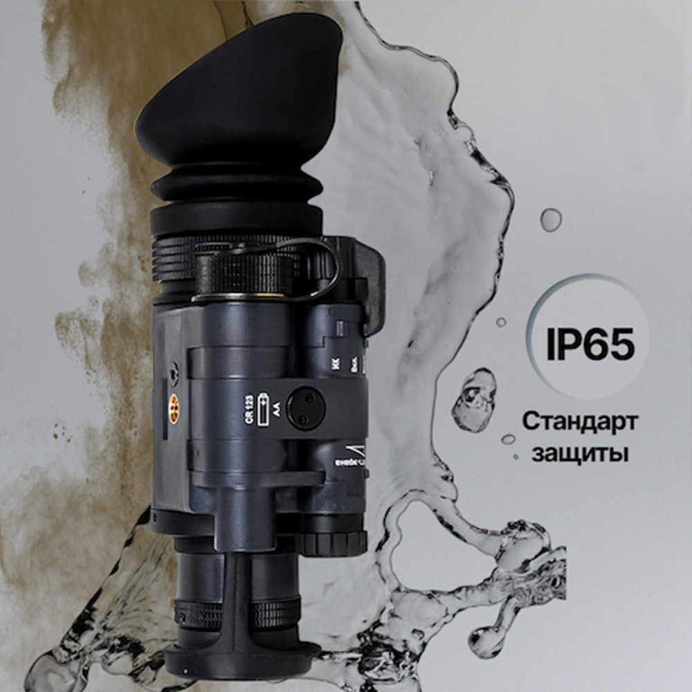Монокуляр выдерживает сложные погодные условия, соответствуя стандарту влагозащищенности IP65. Герметичен и способен выдержать погружение в воду на глубину до 1 метра.