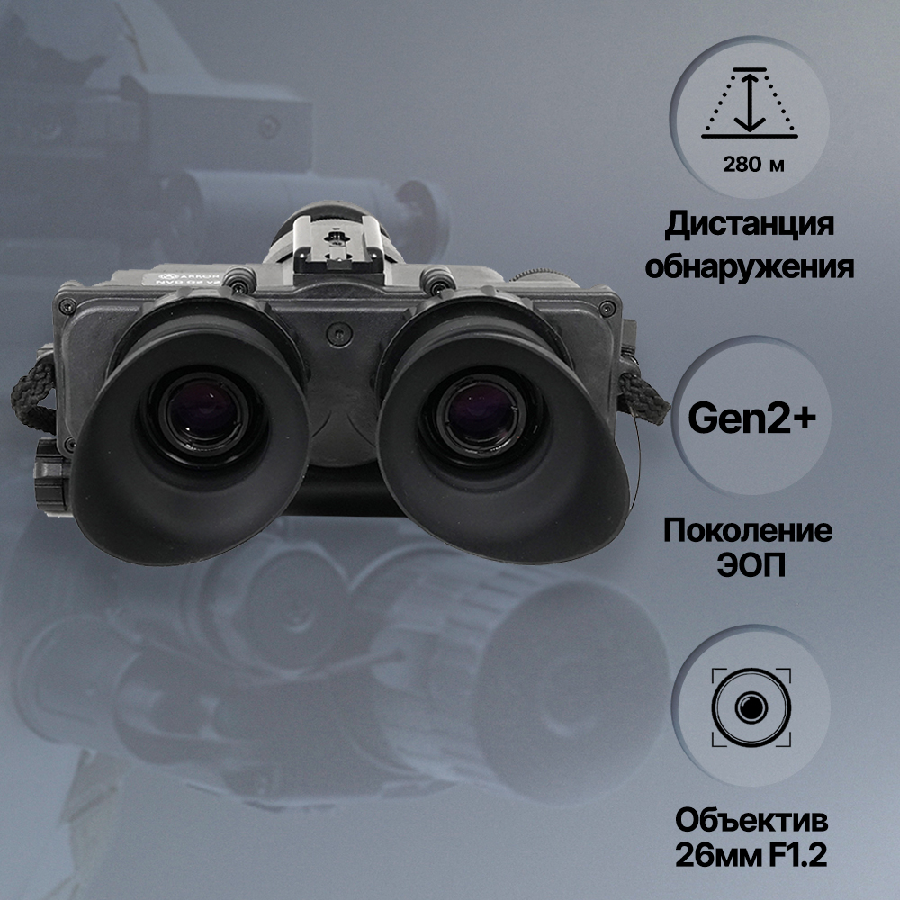 Дальность обнаружения очков составляет 220–280 метров. Бинокулярная система зрения включает два окулярных модуля с диоптрийной корректировкой, обеспечивая комфортное длительное использование. Приборы оснащены электронно-оптическими преобразователями поколения 2+ с ресурсом работы 10 000 часов и зеленым люминофором, наиболее комфортным для человеческого зрения. Светосильный объектив 25,8 мм f/1,2 с ручной фокусировкой позволяет настраивать четкость даже в тактических перчатках, минимальная дистанция фокусировки составляет 25 см. Поле зрения достигает 40 градусов, что соответствует 72 метрам на дистанции 100 м. Питание осуществляется от батареи CR123A или двух батарей AA. Время автономной работы составляет от 60 часов в пассивном режиме и 5 часов при активной работе ИК-подсветки. Устройство работает в диапазоне температур от -40 до +50°C и имеет класс защиты IP67, что позволяет ему выдерживать погружение в воду на глубину до одного метра. В комплекте предусмотрено тактическое крепление на шлем.