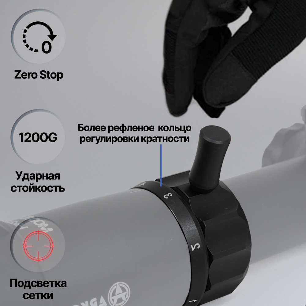 Многоуровневая подсветка с 6-ю режимами обеспечивает отличную видимость сетки на фоне мишени при любых условиях освещения.