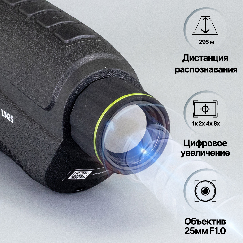 В монокуляре применяется высококачественный германиевый объектив с диаметром объектива 25 мм f1.0. Такая комбинация позволяет собирать максимум инфракрасного излучения даже от объектов с минимальным тепловым контрастом. Базовое увеличение 2,7× в сочетании с плавным 8-ступенчатым цифровым зумом дает возможность достигать эффективного увеличения 21.6× для детального изучения удаленных целей.