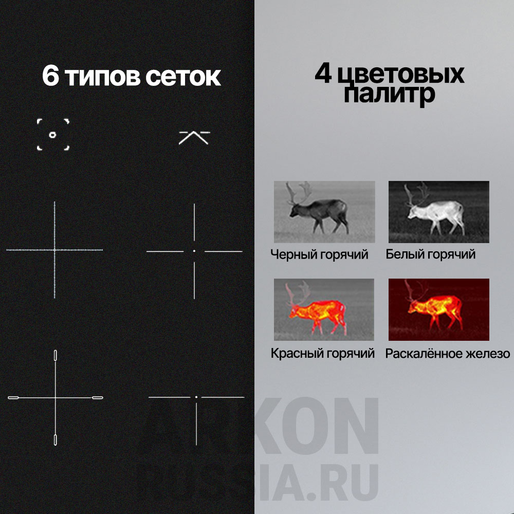 Тепловизионный прицел предлагает на выбор шесть прицельных сеток с различными цветовыми палитрами, а также функцию “картинка в картинке”.Яркость сетки можно настраивать в зависимости от особенностей окружающей обстановки.