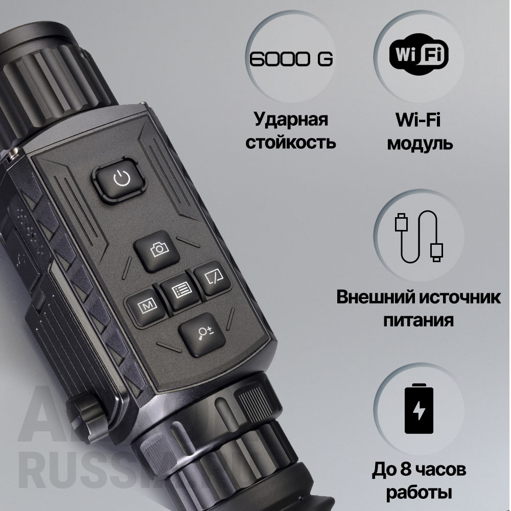 Особенности | Передача видео по Wi-fiПриложение для управления тепловизором6 часов работы от встроенного аккумулятораПлавный ZoomИнверсия сетки на разном фоне |