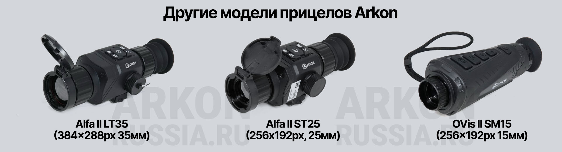В нашем магазине Вы можете купить всю линейку тепловизионных прицелов Arkon, например Arkon Arma HR35 - модель с матрицей 640x512 px, объективом 35 мм, Arkon Arma II LT35 - прицел с объективом 35 мм, матрицей 384х288, либо Arkon Arma LR35L - модель с лазерным дальномером!