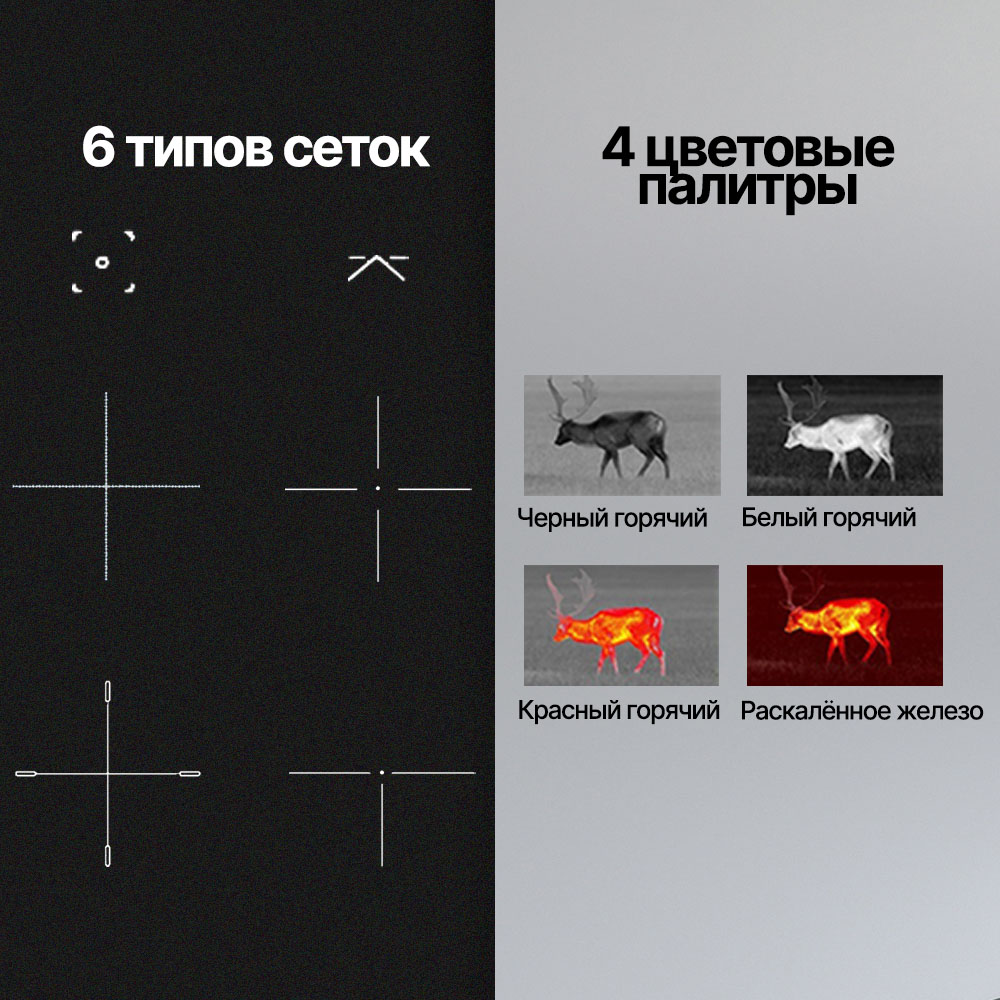 Тепловизионный прицел предлагает на выбор шесть прицельных сеток с различными цветовыми палитрами, а также функцию “картинка в картинке”.Яркость сетки можно настраивать в зависимости от особенностей окружающей обстановки.