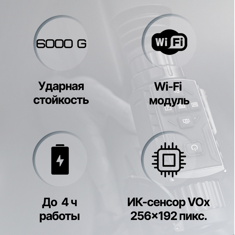Особенности | Передача видео по Wi-fiПриложение для управления тепловизором8 часов работы от встроенного аккумулятораПлавный ZoomИнверсия сетки на разном фоне |