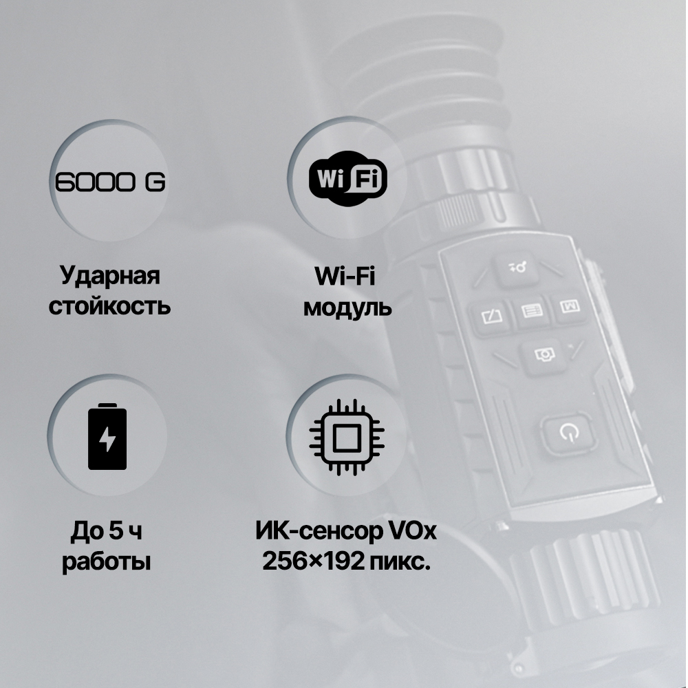Особенности | Передача видео по Wi-fiПриложение для управления тепловизором8 часов работы от встроенного аккумулятораПлавный ZoomИнверсия сетки на разном фоне |