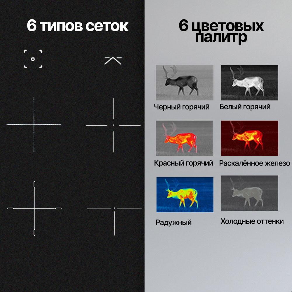 Тепловизионный прицел предлагает на выбор десяти прицельных сеток с различными цветовыми палитрами, а также функцию "картинка в картинке".Яркость сетки можно настраивать в зависимости от особенностей окружающей обстановки.