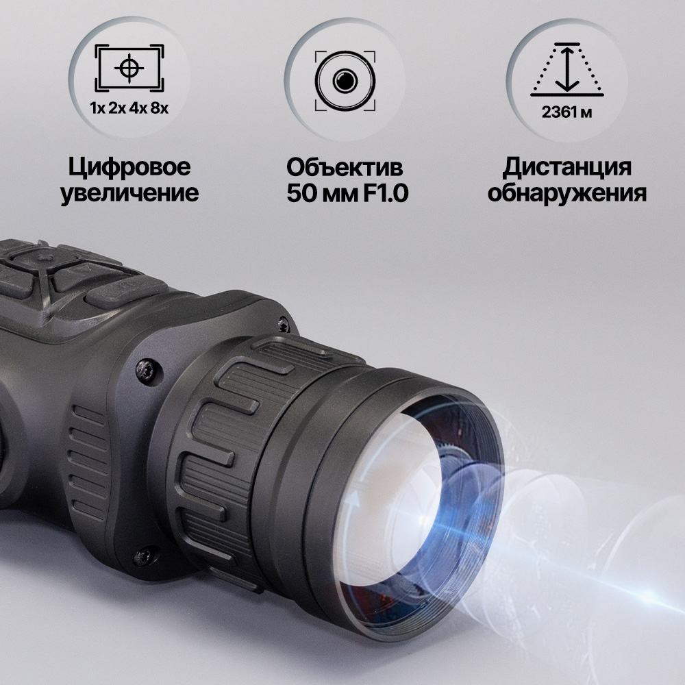 Превосходная оптическая система оснащена германиевым объективом с фокусным расстоянием 50 мм и светосильной диафрагмой F1.0. Базовое увеличение 4,4х дополняется цифровым зумом от 1х до 8х, позволяя достигать кратности до 35,2х для точного прицеливания на экстремальных дистанциях. При минимальном увеличении угол поля зрения составляет 5,2° × 3,9°, формируя обзорное пространство 9,1 × 6,8 метра на дистанции 100 метров. Точная ручная фокусировка осуществляется эргономичным кольцом на корпусе объектива.