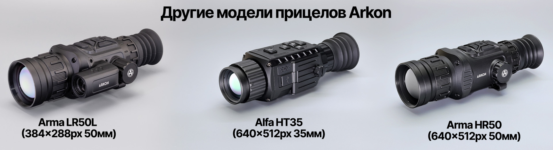 В нашем магазине Вы можете купить всю линейку тепловизионных прицелов Arkon, например Arkon Arma LR50L - флагманская модель компании с с матрицей 384x288 px, объективом 50 мм и лазерным дальномером, Arkon Alfa HT35 - прицел с объективом 35 мм, матрицей 640х512 px, либо Arkon Arma HR50 - модель с матрицей 640x512 px и объективом 50 мм!