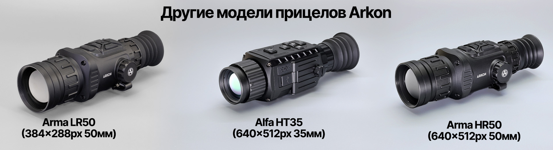 В нашем магазине Вы можете купить всю линейку тепловизионных прицелов Arkon, например Arkon Arma LR50 - флагманская модель компании с с матрицей 384x288 px, объективом 50 мм, Arkon Alfa HT35 - прицел с объективом 35 мм, матрицей 640х512 px, либо Arkon Arma HR50 - модель с матрицей 640x512 px и объективом 50 мм!