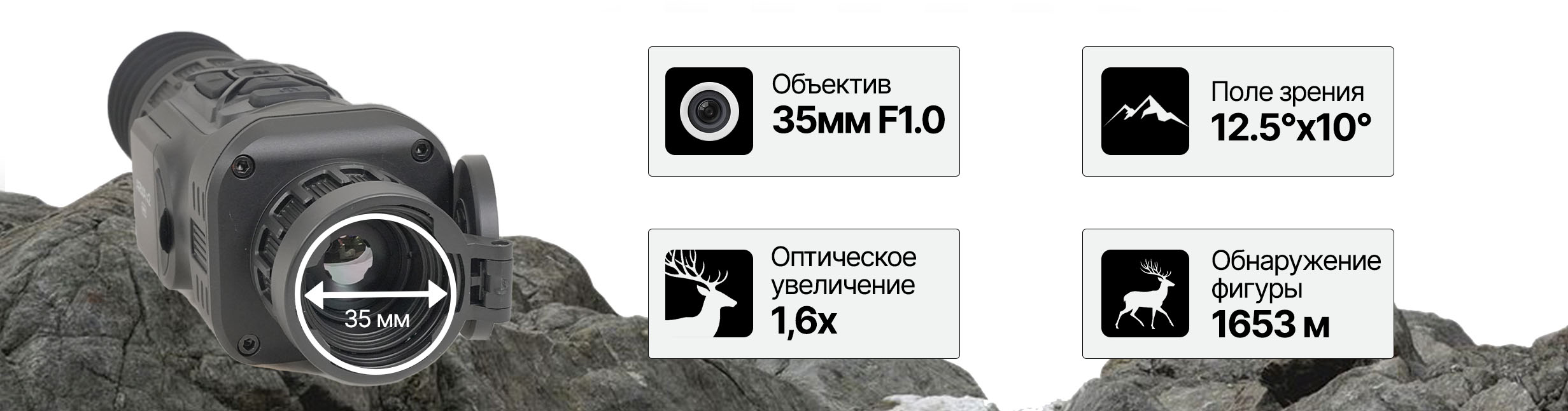 Обнаружение человека до 1653 м, распознавание до 413 м — достаточный диапазон для решения большинства охотничьих задач.