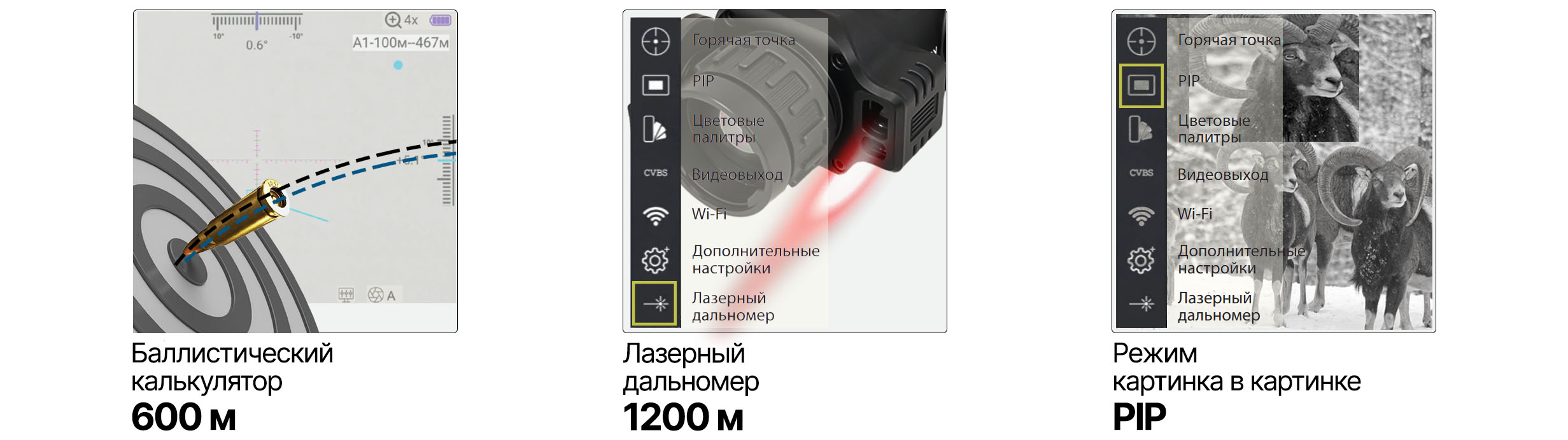 Оснащён качественной оптикой 35мм F/1.0, лазерным дальномером до 1200 м и баллистическим калькулятором с автоматической коррекцией угла наклона к цели. Прицел создан для экстремальных условий: защита IP66, расширенный температурный диапазон, автономная работа до 4,5 часов от съёмного аккумулятора. Эргономичное управление адаптировано для работы в перчатках и при слабом освещении.