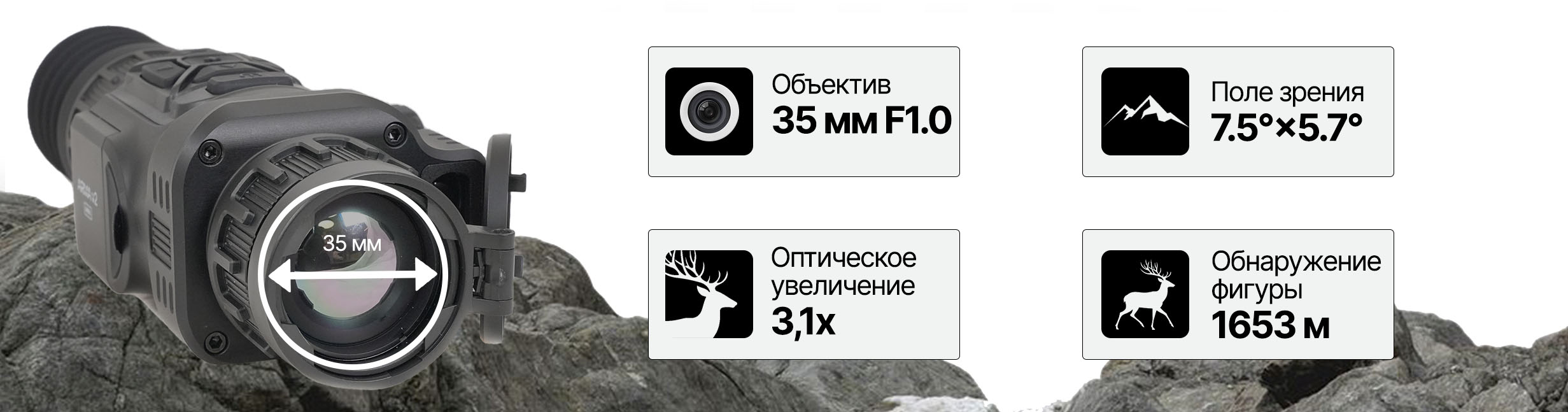 Обнаружение человека до 2365 м, распознавание до 590 м — достаточный диапазон для решения большинства охотничьих задач.