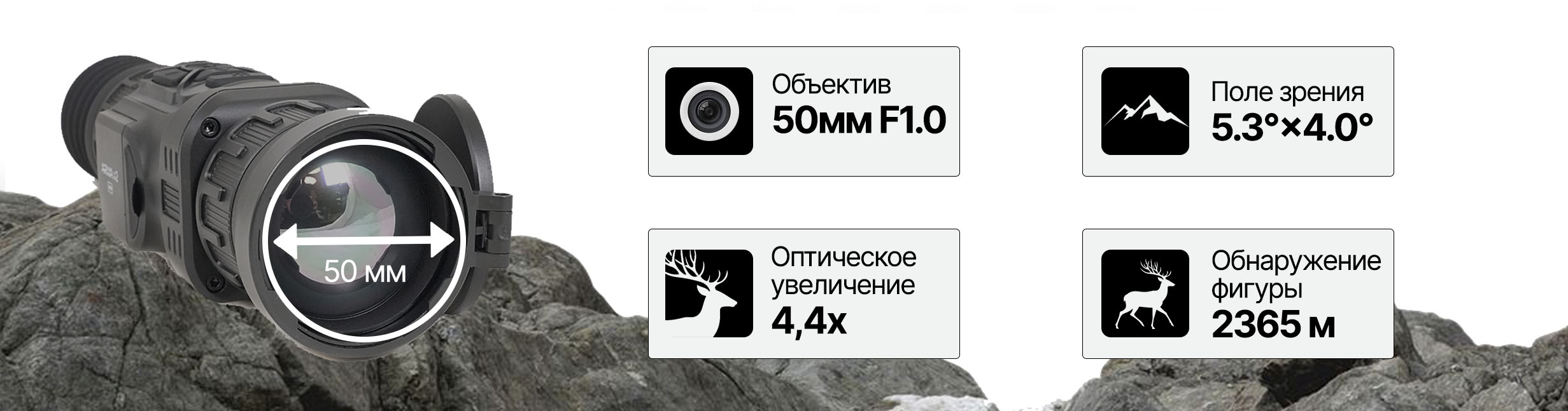 Оснащён качественной оптикой 50мм F/1.0, лазерным дальномером до 1200 м и баллистическим калькулятором с автоматической коррекцией угла наклона к цели. Прицел создан для экстремальных условий: защита IP66, расширенный температурный диапазон, автономная работа до 4,5 часов от съёмного аккумулятора. Эргономичное управление адаптировано для работы в перчатках и при слабом освещении.