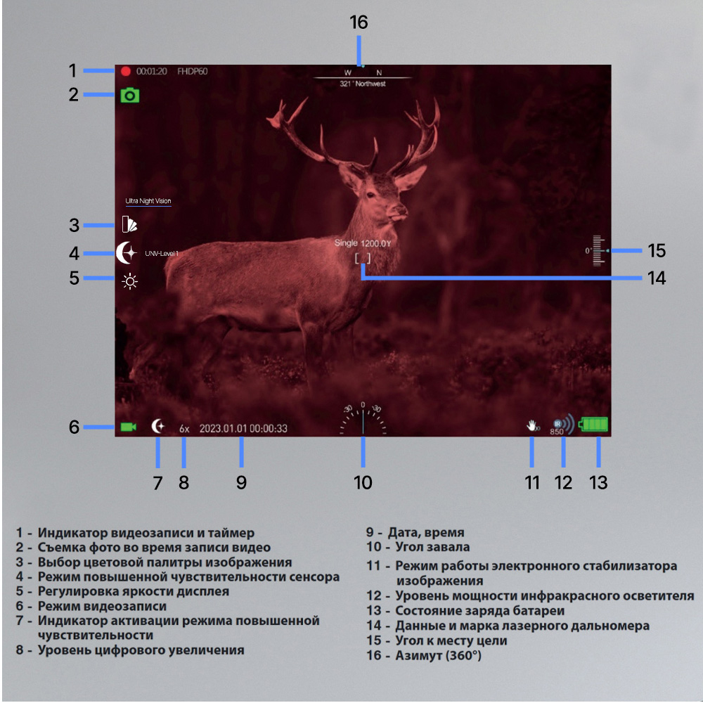 Инфракрасная подсветка легко включается при переходе в ночной режим, а специальный программный алгоритм отвечает за электронную стабилизацию изображения. Это позволяет избежать эффекта дрожания даже при наблюдении за объектами на дальнем расстоянии. Бинокль поддерживает выбор цветовых палитр отображения: дневной режим, чёрно-белый, зелёный и янтарный, что помогает адаптироваться к разным условиям.