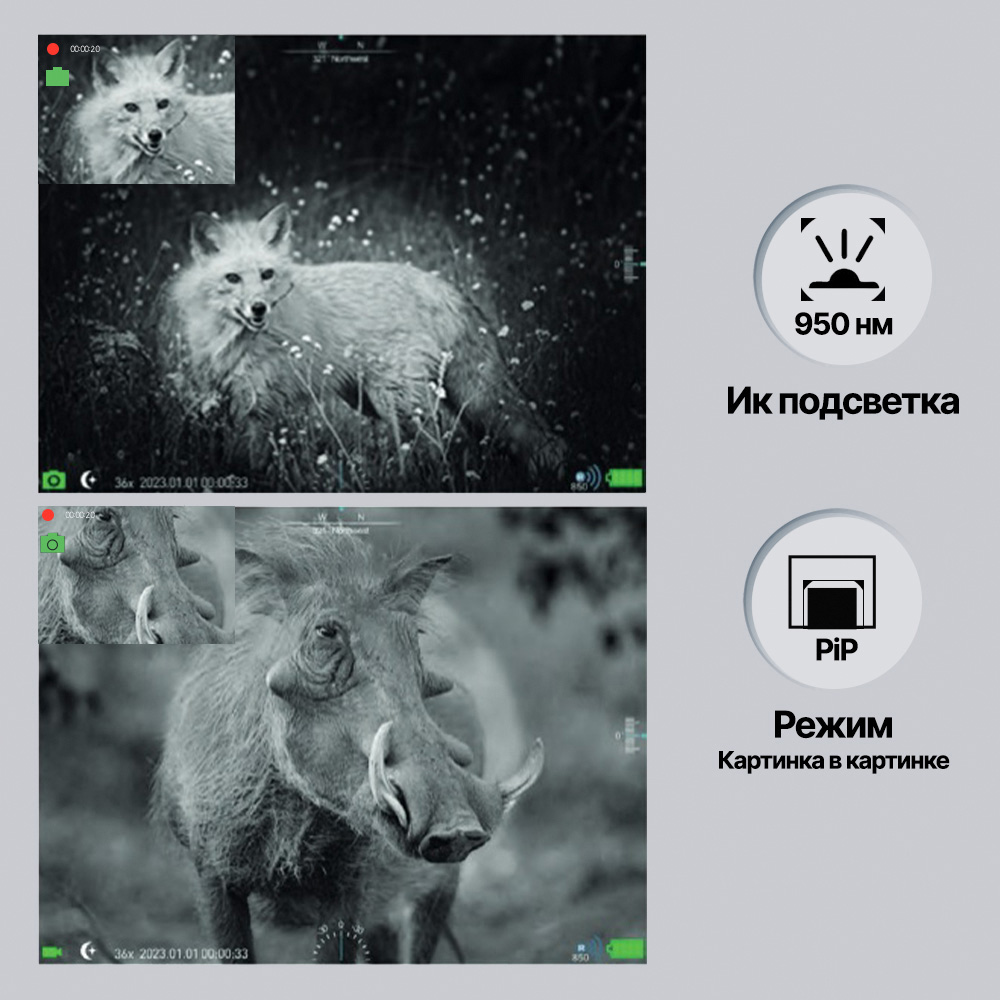 Инфракрасная подсветка легко включается при переходе в ночной режим, а специальный программный алгоритм отвечает за электронную стабилизацию изображения. Это позволяет избежать эффекта дрожания даже при наблюдении за объектами на дальнем расстоянии. Бинокль поддерживает выбор цветовых палитр отображения: дневной режим, чёрно-белый, зелёный и янтарный, что помогает адаптироваться к разным условиям.