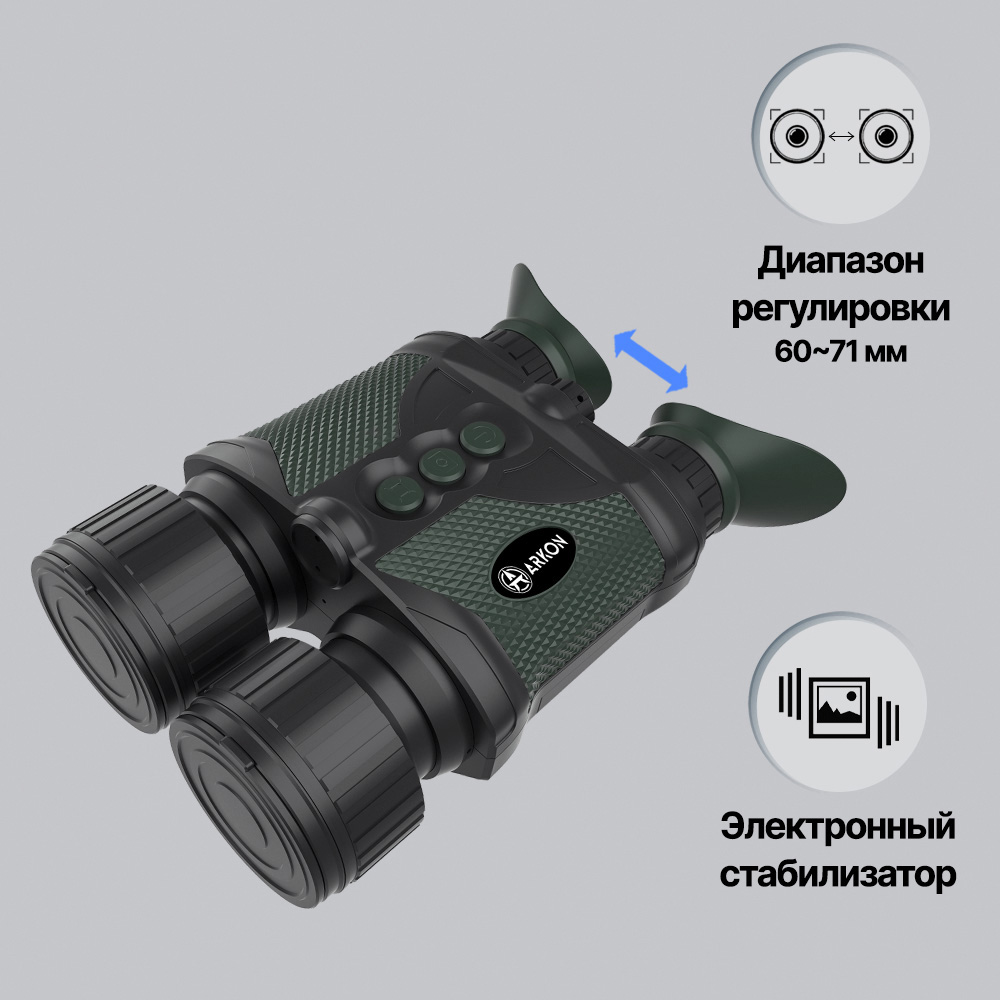 Инфракрасная подсветка легко включается при переходе в ночной режим, а специальный программный алгоритм отвечает за электронную стабилизацию изображения. Это позволяет избежать эффекта дрожания даже при наблюдении за объектами на дальнем расстоянии. Бинокль поддерживает выбор цветовых палитр отображения: дневной режим, чёрно-белый, зелёный и янтарный, что помогает адаптироваться к разным условиям.